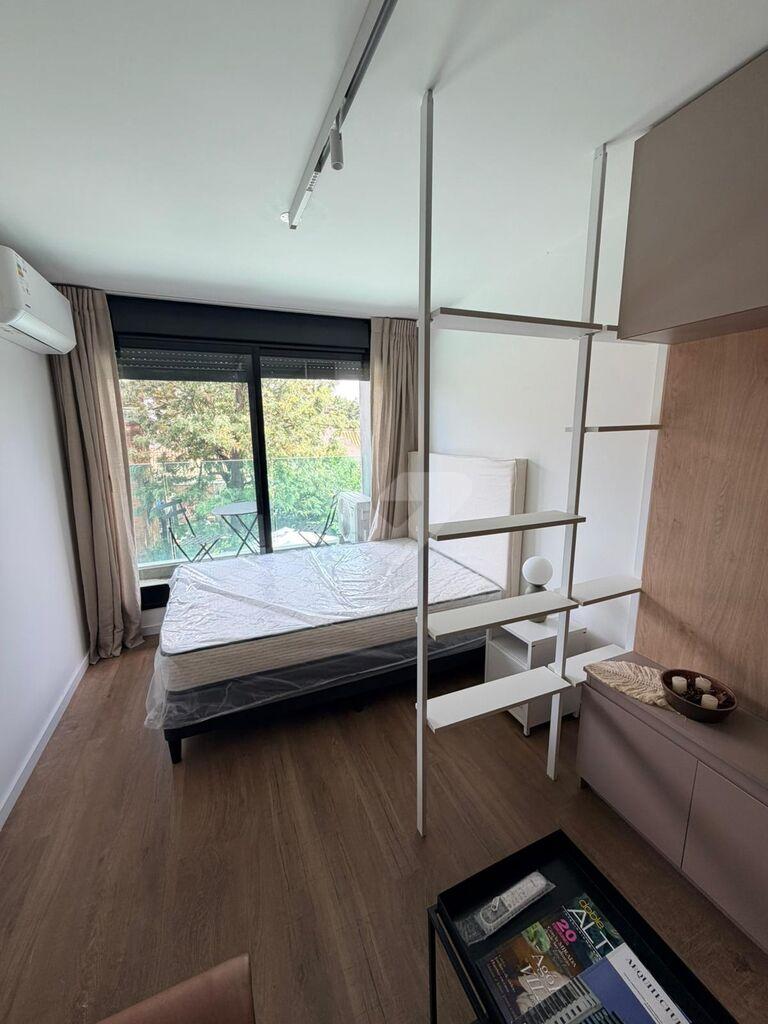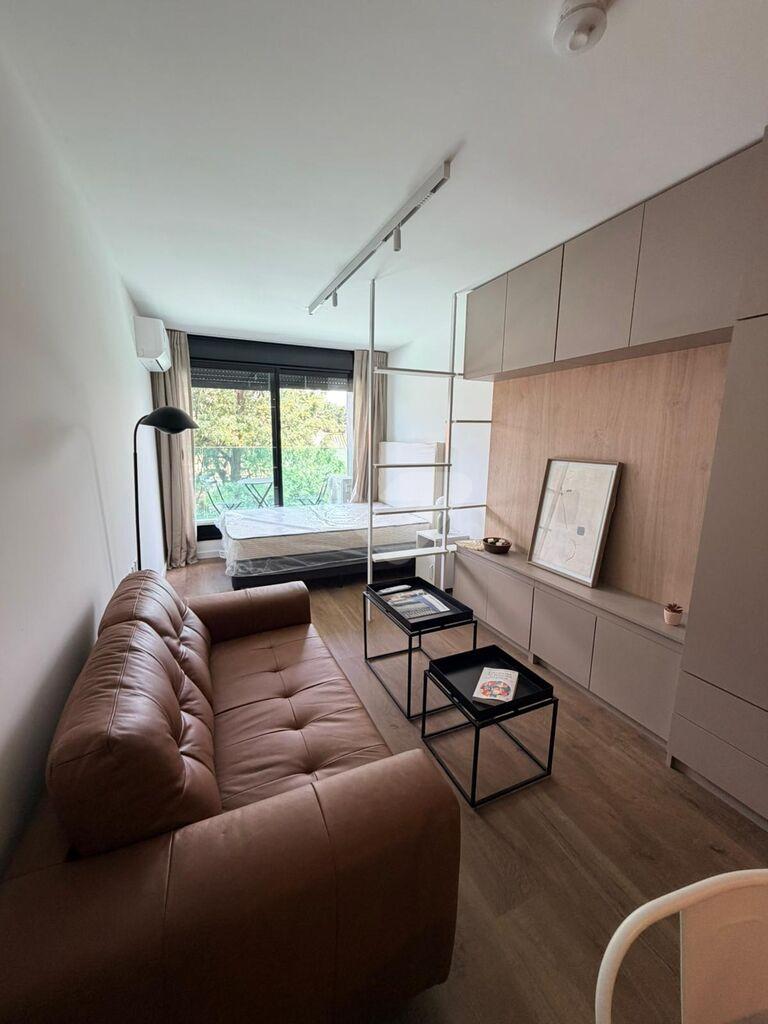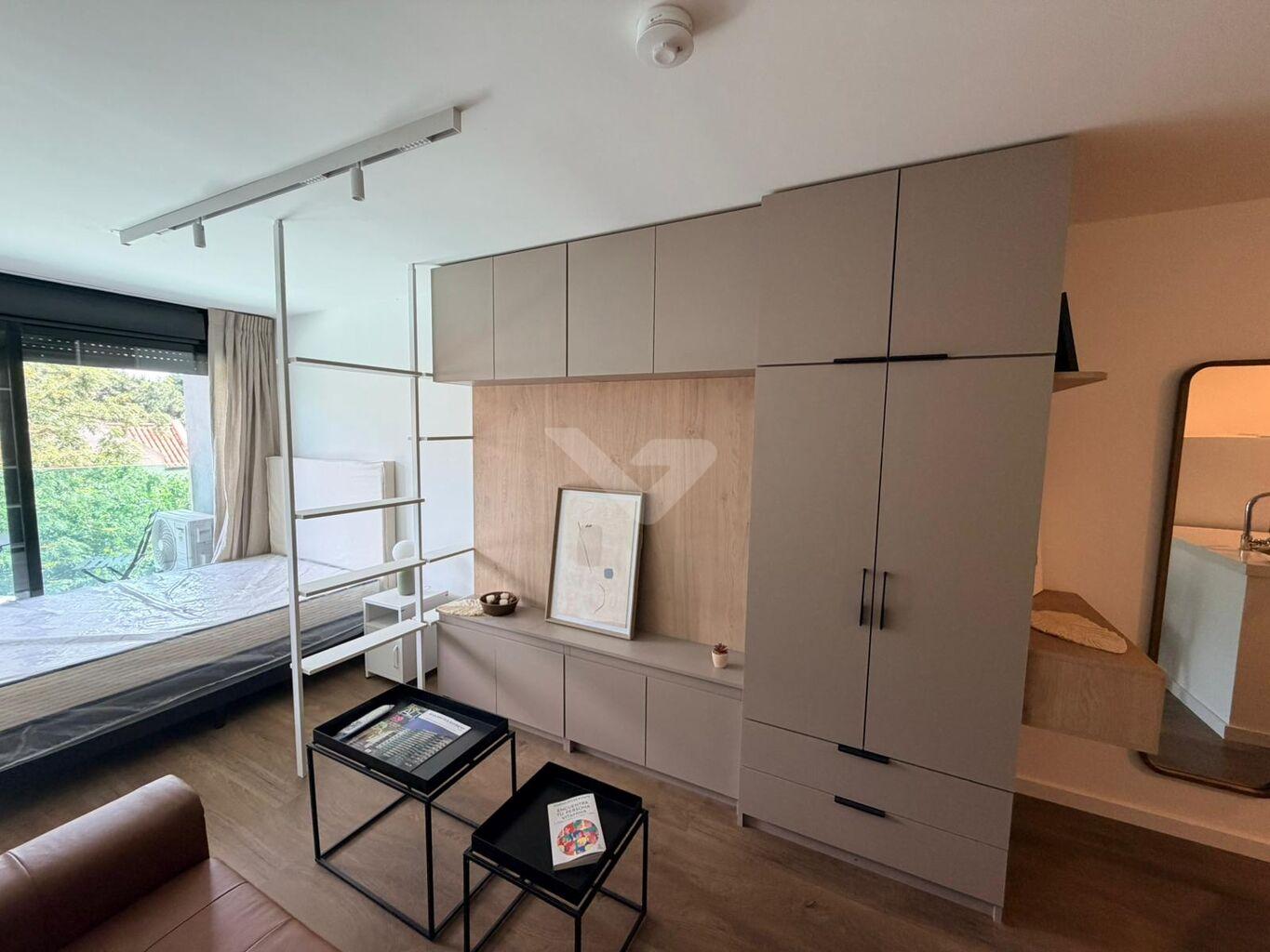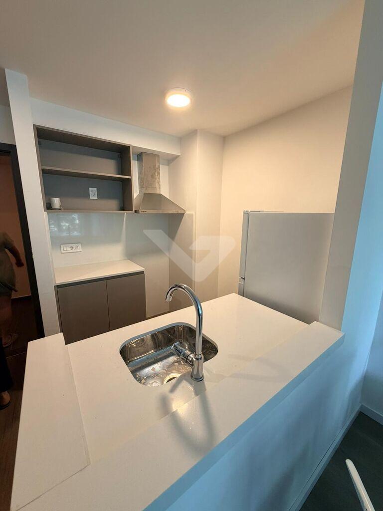 Alquiler monoambiente sobre Av, de las Americas amueblado-Gran loft, Cocina integrada con campana y mesada tipo barra. Garage